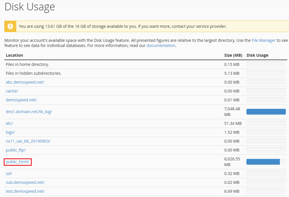 From here you can see how much storage space (or disk space) is being used by each directory and sub-directory in your account