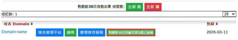 如已經啟用"自動續期功能/AUTO RENEWAL" - 自動續期功能已啟動,閣下將於域名到期日前30天前收到續期帳單。