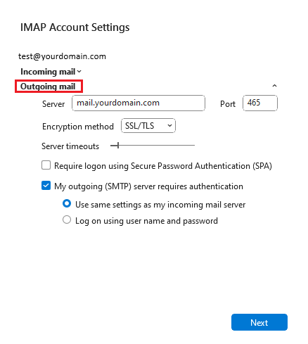 - check My outgoing server (SMTP) requires authentication ", select " Use same settings as my incoming mail server "