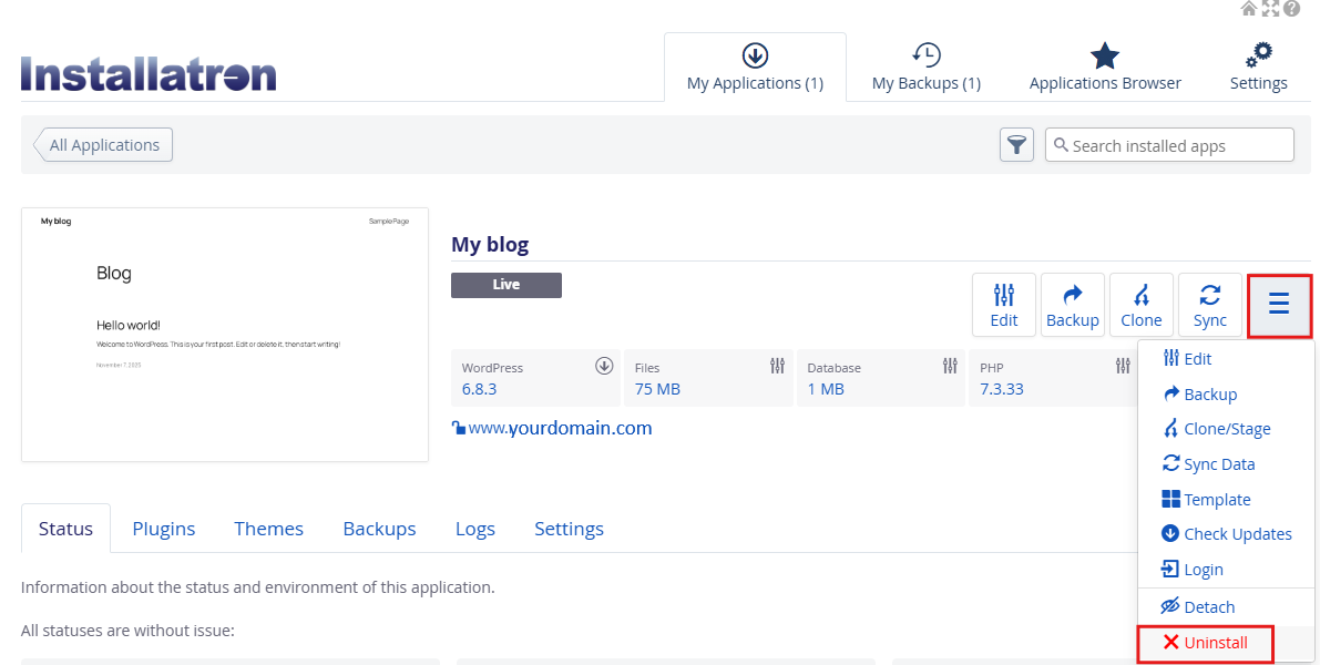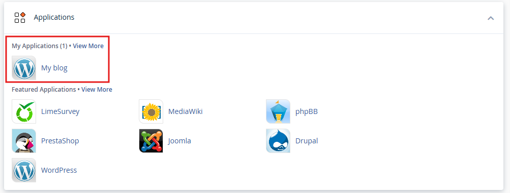 After logging in to cPanel, if you have previously installed an application successfully through “Installatron”, you will see the application listed under My Applications. Click on that application.