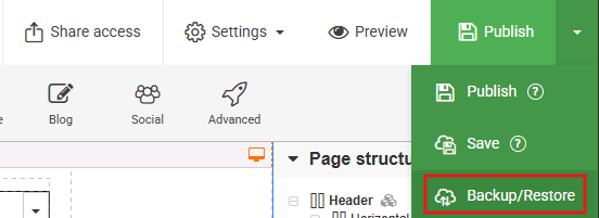Hover over "Publish" in the top-right corner and click "Backup / Restore".