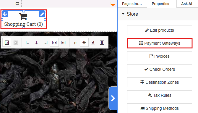 Click the shopping cart, then in the right-hand settings go to > Store > “Payment Gateways”.