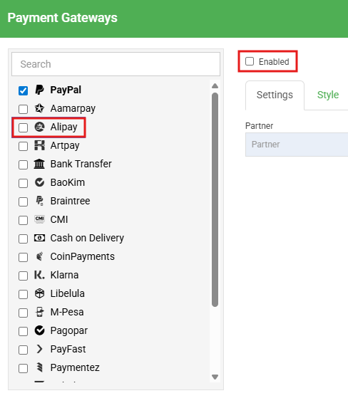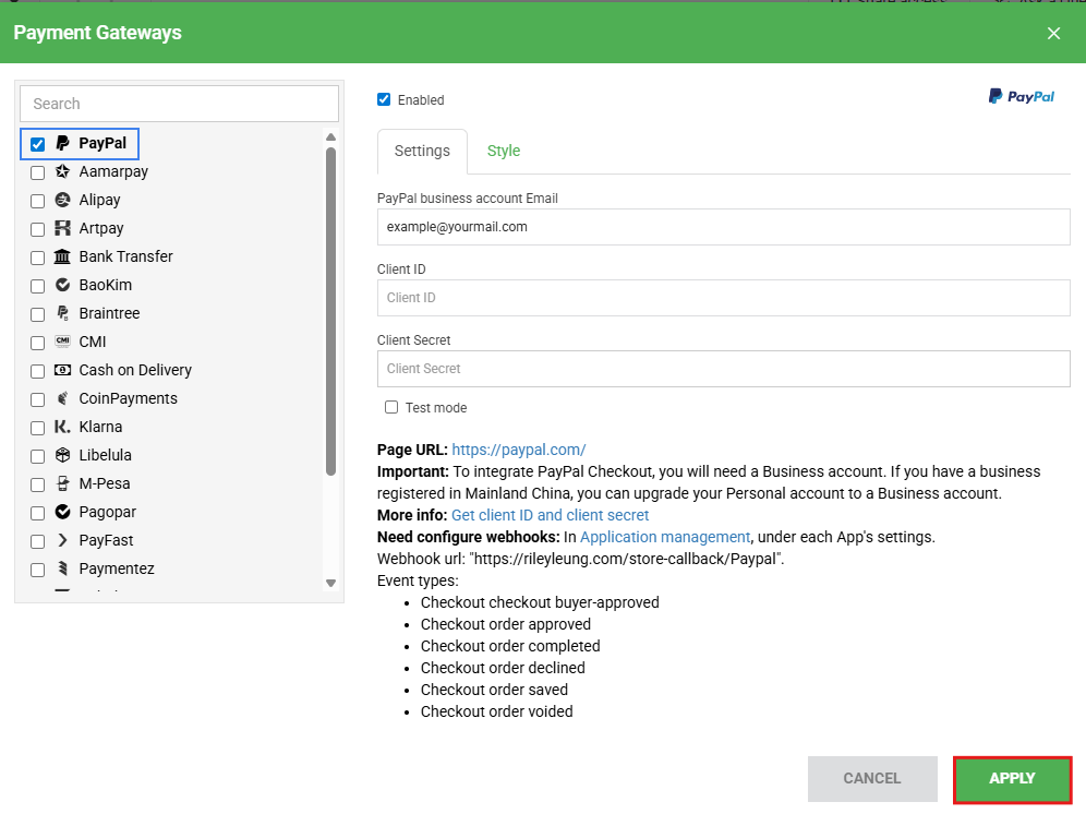 Here, you can tick to enable different payment methods, click "Apply" when finished.