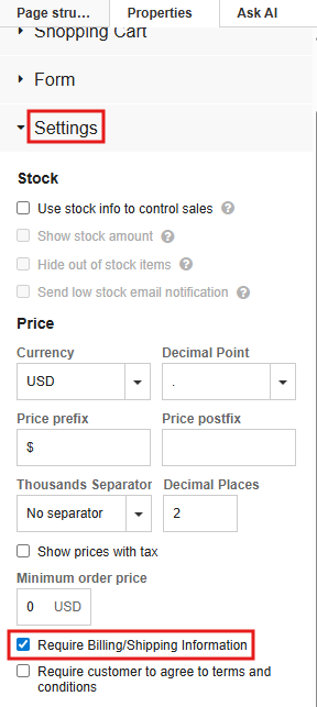 To change payment settings and manage orders, you must add a shopping cart button on the web page.