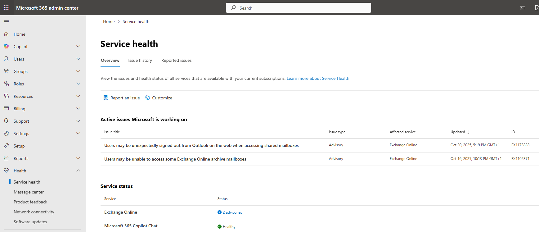 As Microsoft 365 Admin, you can check service health in Microsoft 365 admin center.