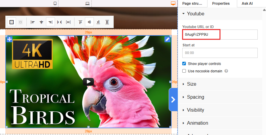 The video has been successfully added to the Builder. Drag the highlighted resize handles in the image to adjust its size.