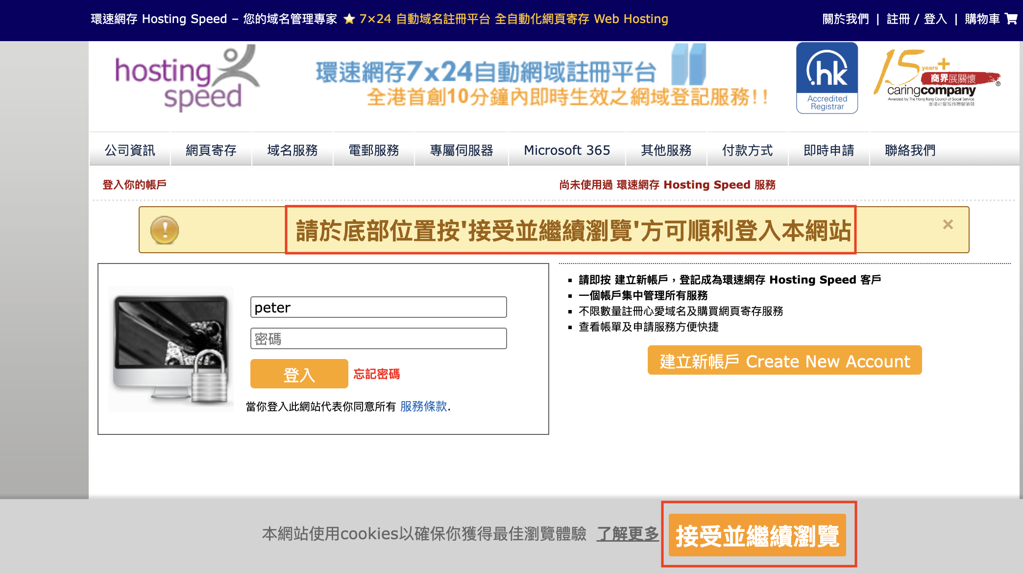 請按底部的"接受並繼續瀏覽",並重新輸入帳戶及密碼。